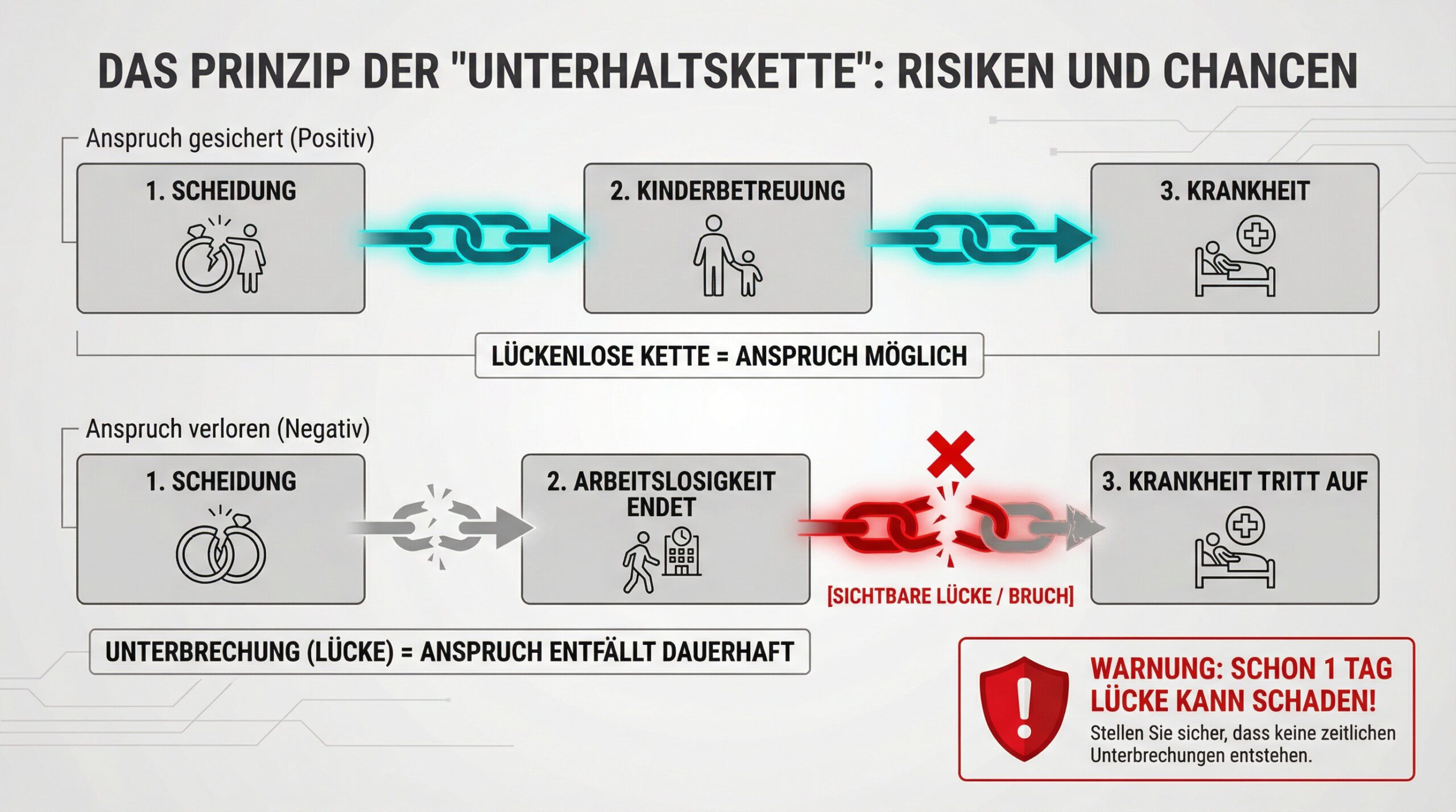 Eine danach eintretende Arbeitslosigkeit oder Erkrankung kann dann als neues, allgemeines Lebensrisiko gewertet werden, für das der geschiedene Partner nicht mehr unterhaltsrechtlich einstehen muss. Ob die Unterhaltskette tatsächlich als durchbrochen gilt oder ein Anspruch (ggf. unter einem anderen Unterhaltstatbestand) erneut entstehen kann, ist jedoch eine Frage der gerichtlichen Bewertung im Einzelfall.